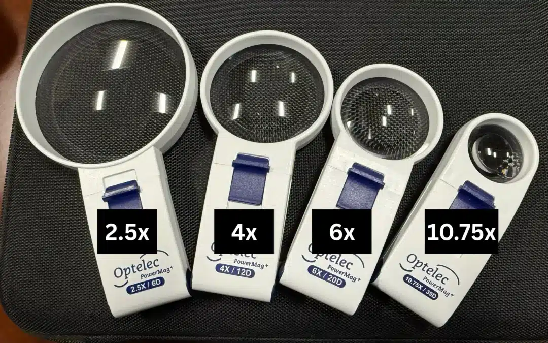 The main challenge with optical magnifiers arises when you need more magnification. There is a direct relationship between the power of the lens and its physical size. To increase magnification, the curvature of the lens must be increased. This physical law means that as the magnification power goes up, the diameter of the lens must come down.